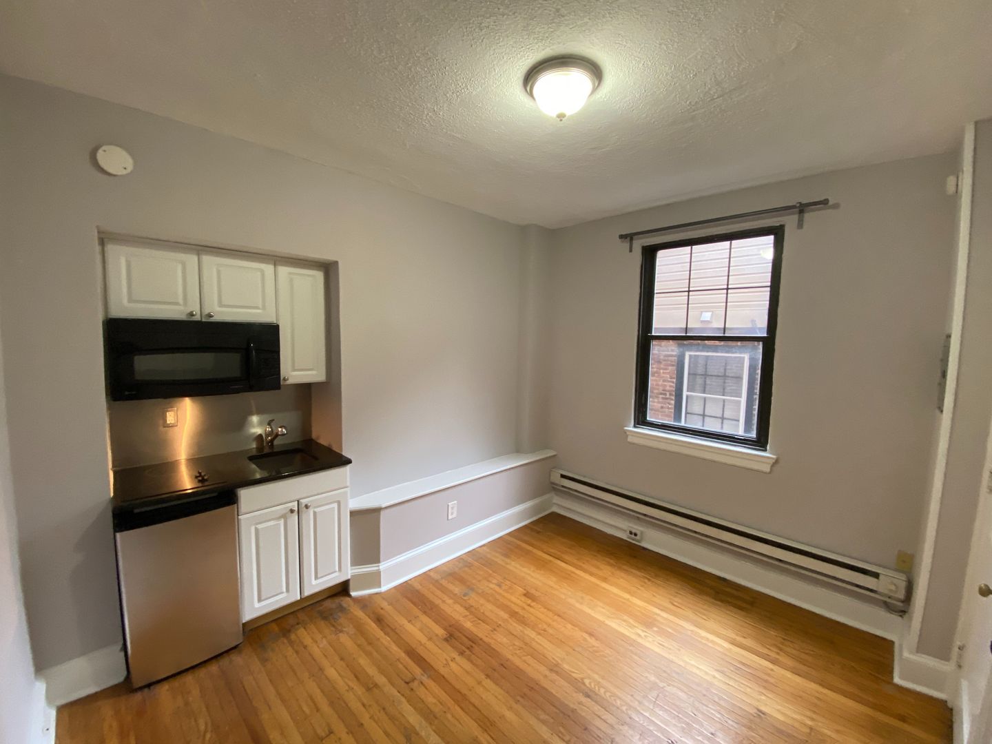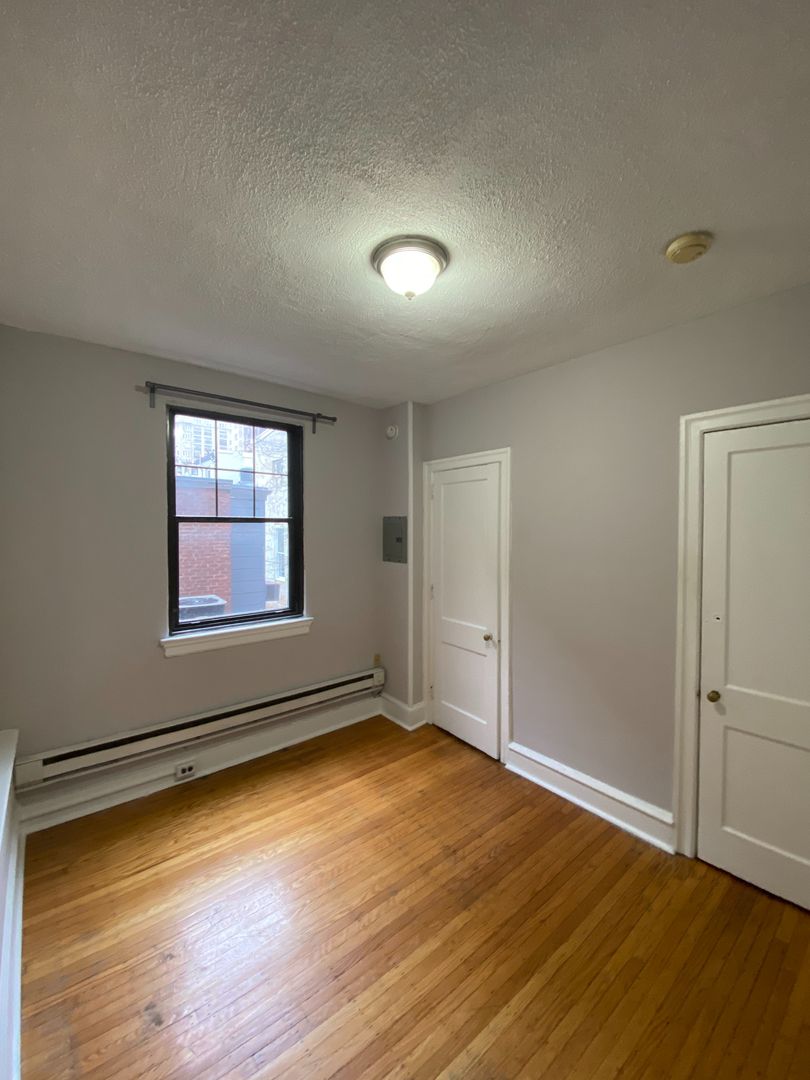 Renovated micro-studio with beautiful hardwood floors located on a quiet street in Rittenhouse square. Kitchenette features granite counter, 2 burner stove-top, and stainless steel appliances (fridge µowave). Bathroom completed with marble floors and crisp white subway tile shower/tub. Window AC unit provided. Coin-operated laundry room in building.